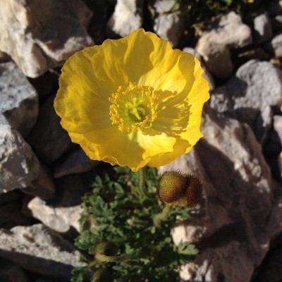 Der gelb blühende Alpenmohn erreicht eine Wuchshöhe von ungefähr cm. Er eignet sich für den Steingarten oder als Topfpflanze. Der gelber Alpenmohn , die Moretti Glockenblumen (rechts) und das Dolomiten- Fingerkraut wachsen in den Schutthalden der Dolomitenfelsen.